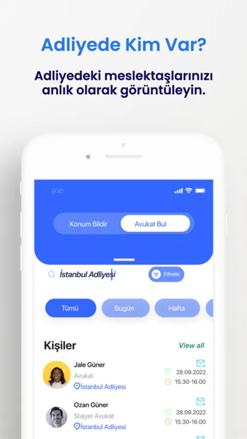 Konuma dayalı iletişim özelliği sayesinde adliyelerden anlık konum paylaşabilir, adliyelerdeki meslektaşlarınızı bulabilir, işbirliği yapabilir ve yeni fırsatları keşfedebilirsiniz.