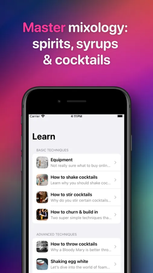 Wait, there's more! Each technique in our app comes to life with captivating video examples. Learn the art of mixology visually and enhance your skills with ease. You'll be mesmerizing your guests with your stylish moves behind the bar.