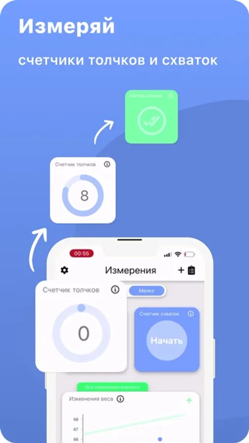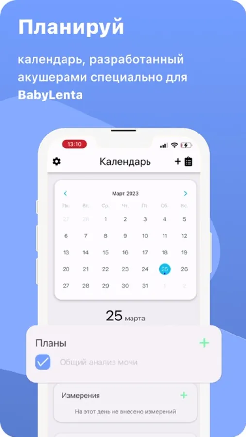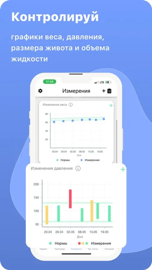 В разделе Измерения вы найдете удобные графики изменения веса, артериального давления, размера живота и объема жидкости. В приложении также доступны счетчик схваток и счетчик толчков.