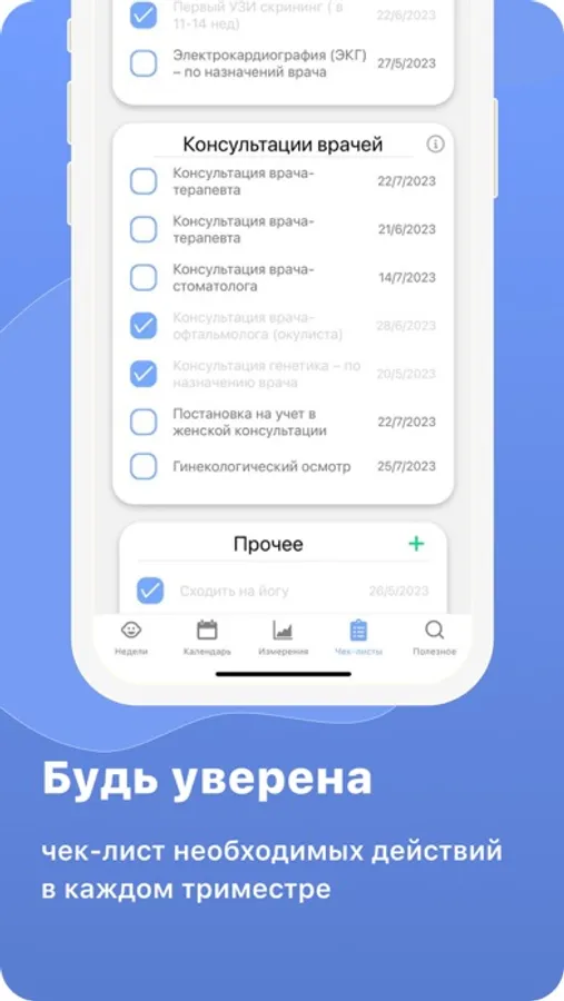 В разделе Чек-листы мы собрали рекомендации акушеров-гинекологов по каждому триместру и упаковали в продуманный чек-лист, который позволит вам не пропустить сдачу анализов и другие важные действия в каждом триместре.