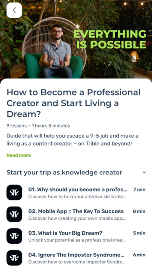 With Trible, you gain access to a comprehensive suite of tools and resources that make course creation a breeze. From crafting compelling content to structuring your courses effectively, our platform guides you every step of the way. Tap into our extensive library of courses and learn from experienced mentors who have successfully monetized their knowledge.