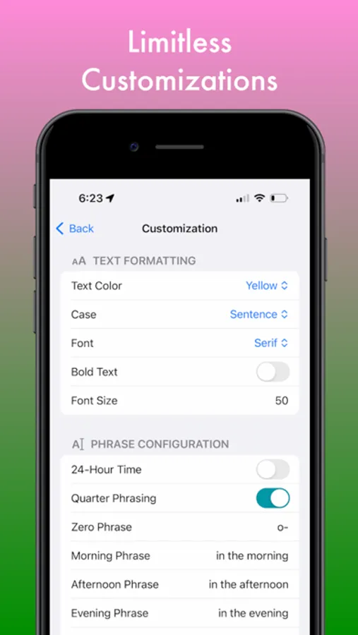 Tell time your way. Customize the formatting of the time as you desire, and the app will remember your choices. Personalize your clock with settings for Zero Phrase, Morning Phrase, and Afternoon Phrase, allowing you to infuse each moment with your unique flair. Effortlessly add prefixes and suffixes to further tailor your time displays to perfection. With TextTime, time isn't just measured—it's expressed in your own words.