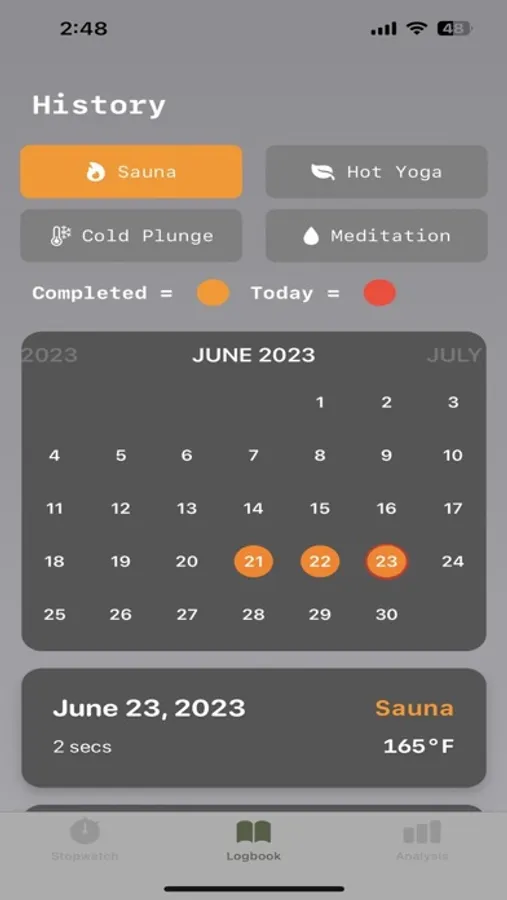 - Record details about each session, including duration, temperature, and perceived intensity.