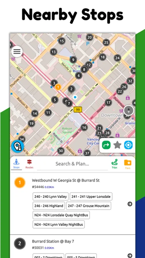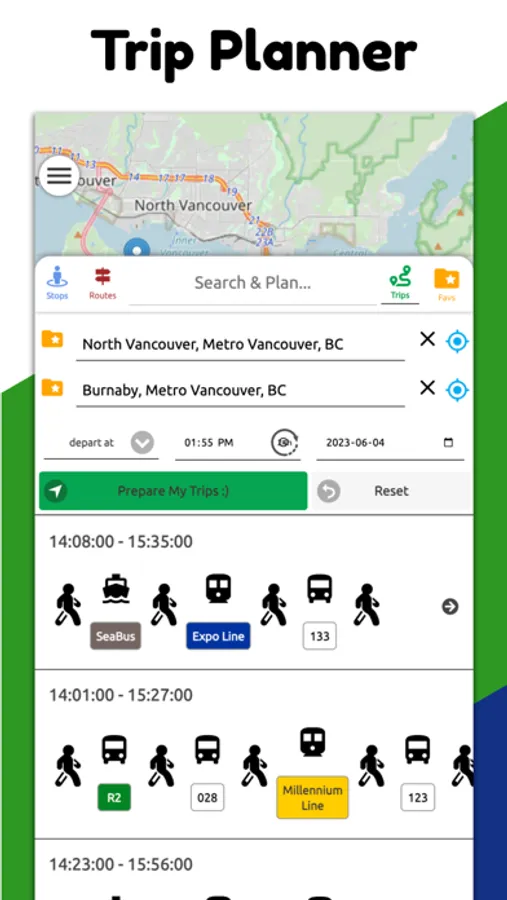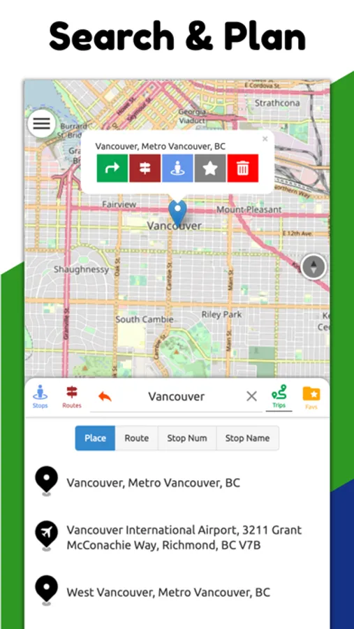 App offers interactive commuting over the map along with real time bus ferry and skytrain arrival schedules at any given location in the city.