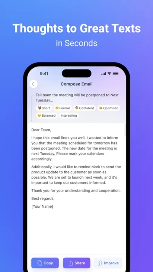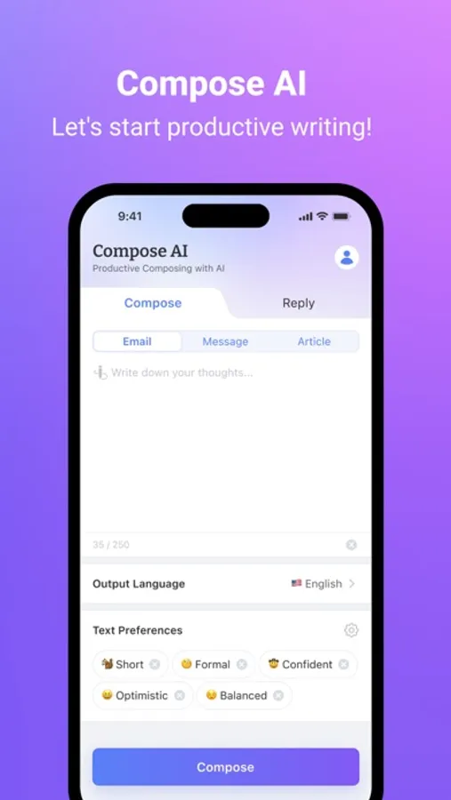 Compose AI employs advanced ChatGPT and GPT4 models to comprehend your thoughts and the context. Simply input your ideas, and watch them turn into well-structured emails, social media posts, or texts.