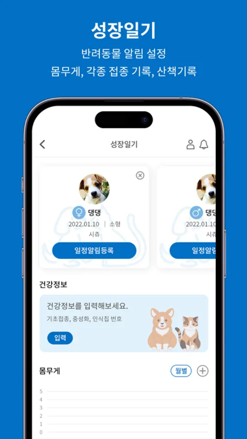 반려동물이 성장해가는 과정을 성장일기를 통해 기록할 수 있어요!