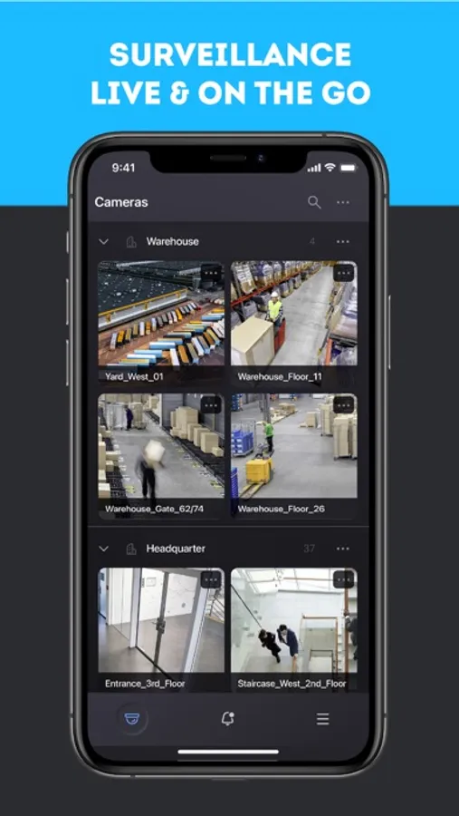 The cameras of a site are displayed in an overview with refreshable and scalable preview images. After a refresh, this view allows for quick and intuitive information about the overall situation of a site. The individual cameras can be selected for playback mode by tapping on them or switched to display live video directly in the overview by doing a longpress on the thumbnail.