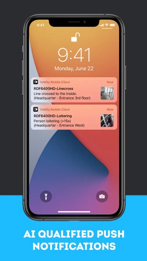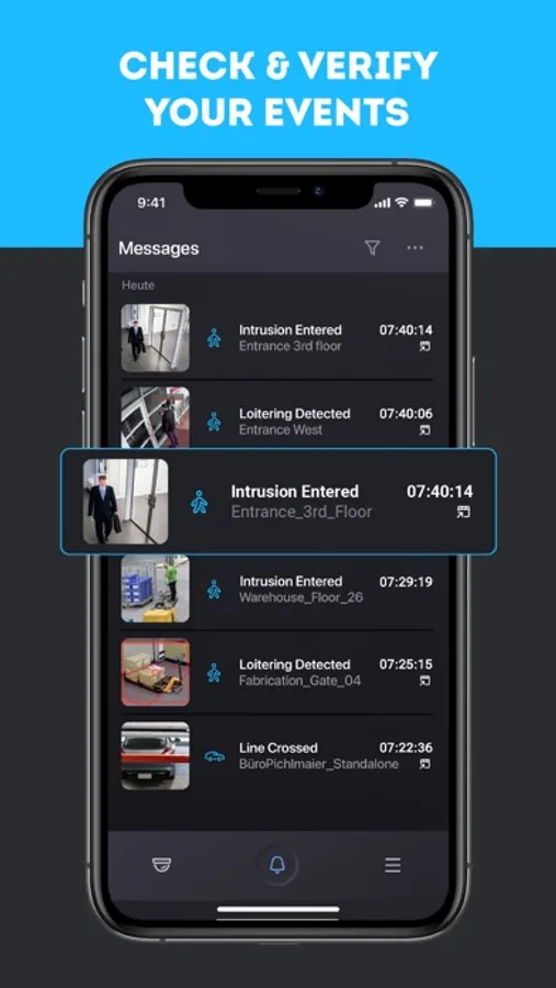 The status and event messages of the connected cameras and recording systems are transmitted via the Connect Push Service to the Mobile Client, which displays all messages in a clear list and, if necessary, with a preview image of the triggering event. Playback of the event can be activated directly from the message list, which is then clearly displayed in the timeline together with other messages.