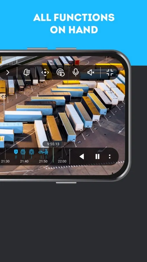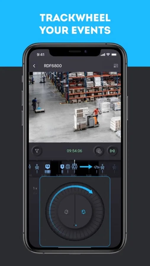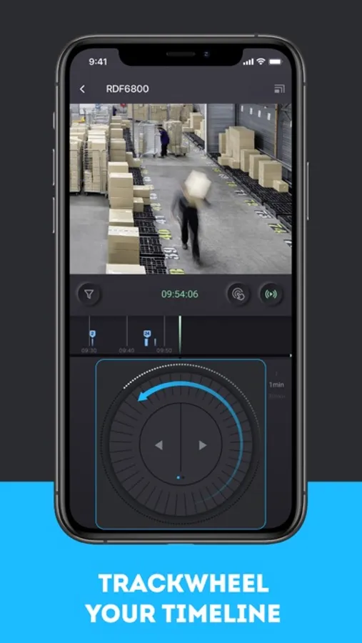 After selecting a camera in the overview, it is first displayed with a live image that already supports pinch-to-zoom. The interactive and scalable timeline can be used for initial positioning in the recording by swiping, and allows direct selection of an event by tapping the displayed icons. For convenient playback control with only one hand, the multifunctional track wheel is available, whose step width can be adjusted as well as the playback speed.