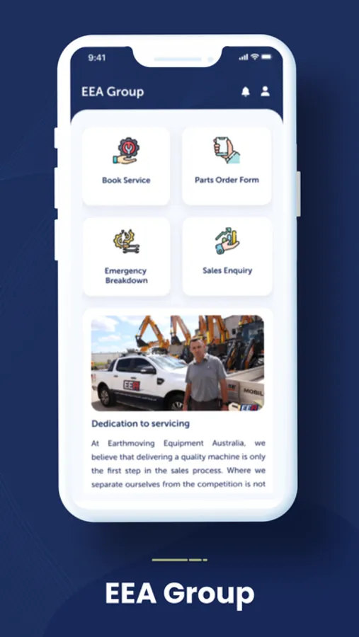 Welcome to EEA Group mobile app, the comprehensive mobile application brought to you by Earthmoving Equipment Australia Pty Ltd to simplify your construction needs. As a company, we understand the challenges you face on a daily basis with your earthmoving equipment. That's why we created EEA Group mobile app, a digital platform designed to provide you with rapid solutions and service at the touch of your fingertips.