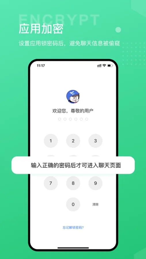 应用加密---设置应用锁密码后,每次启动APP都要输入密码解锁才可使用,避免聊天信息被偷窥;