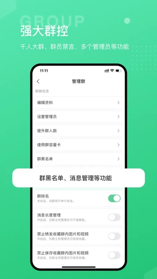 强大群控---千人大群,成员保护,群员禁言等丰富功能;