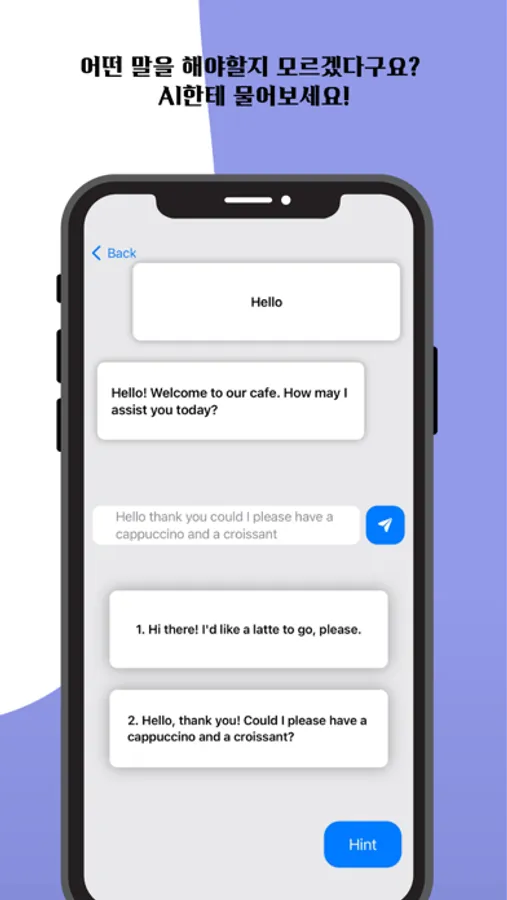 Hint버튼을 눌러보세요! AI가 어떻게 말해야할지 가이드라인을 제공해 줄 것입니다!