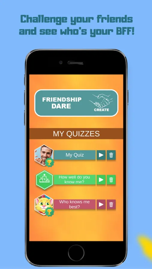 The best way to find out how well your friends know you is with a BFF test. Fun games to play with friends help you create fun quizzes to share with friends and see how well they know things about you. How many of your friends can guess your favorite movie, favorite band, or what kind of phone you own? Create a custom BFF friendship test quiz and share it with people! Check out the leaderboards in the bestie test games for any of your fun quizzes and see who knows you best! Test your BFF with fun games for friends and have fun!