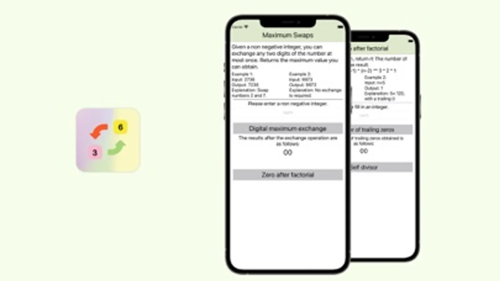 A simple application, but it cannot be underestimated. It includes several major features and functions: 1 Given a non negative integer exchange to obtain the maximum value; 2. The self divisor of the number divided by each digit it contains; 3. Given an integer, return n! The number of trailing zeros in the result. These seemingly simple operations contain great wisdom and can greatly enhance your own skills.