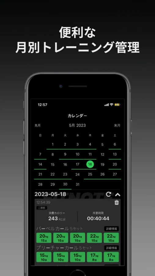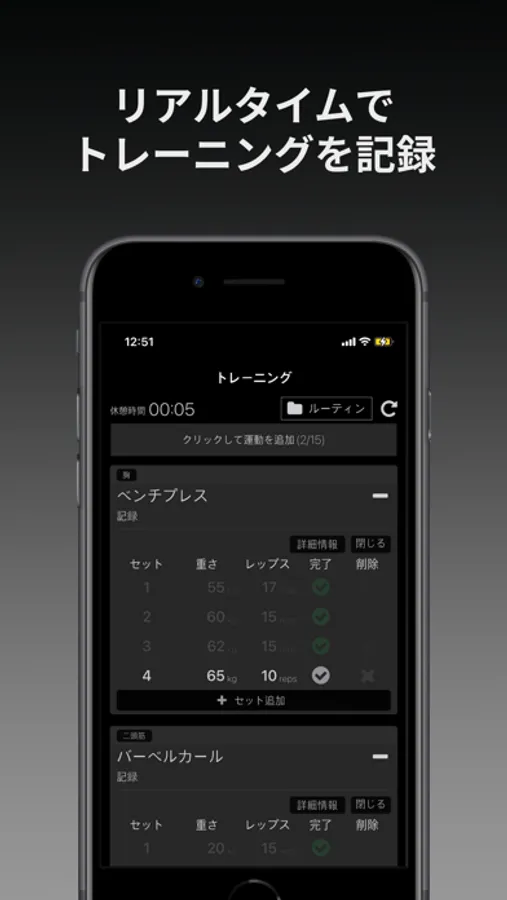 1. 便利な運動の記録 : リアルタイムで運動のセット、回数、重さを記録します。