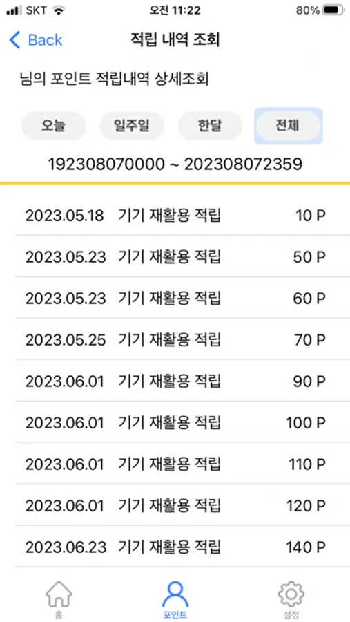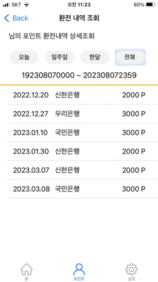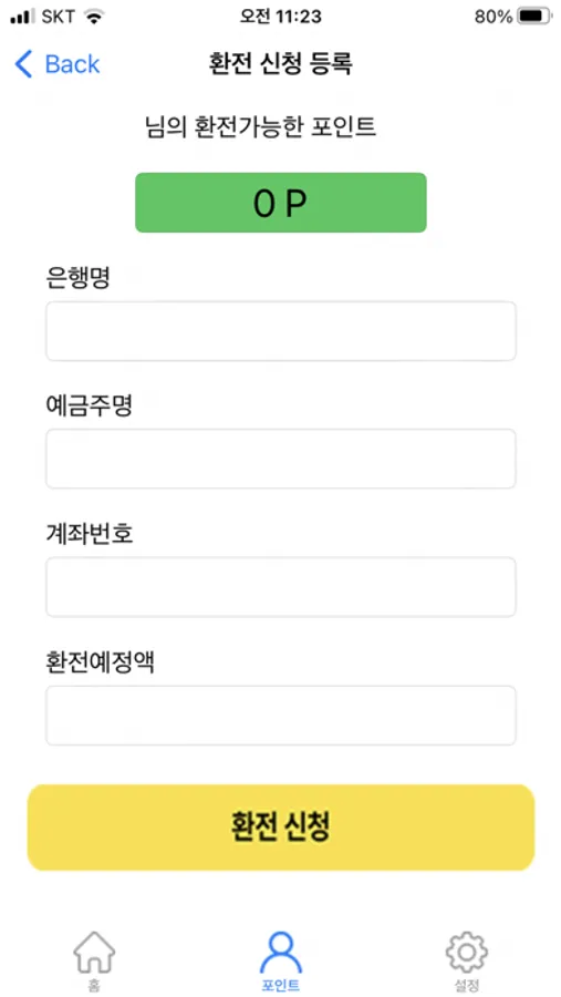 사용자의 누적된 포인트를 현금 또는 물품으로 환전 요청할 수 있습니다.