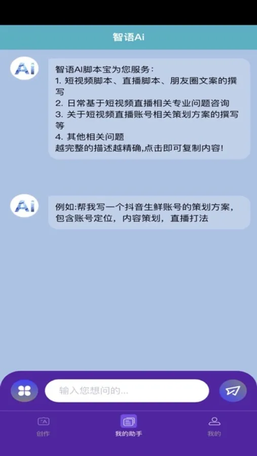 智语Ai脚本宝是一款短视频直播赛道的AI应用软件,帮助内容创作者写短视频脚本、直播脚本、朋友圈文案以及回答短视频直播相关专业问题的软件。
