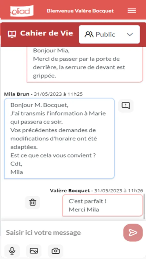 - le Cahier de Vie : Pour échangez avec l'agence, vos intervenants, vos proches
