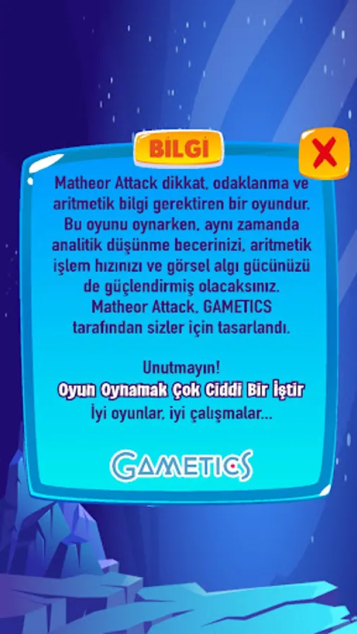 Matheor Attack, dikkat odaklanma ve aritmatik bilgi gerektiren bir oyundur. Bu oyunu oynarken, aynı zamanda analitik düşünme becerinizi, aritmetik işlem hızınızı ve görsel algı gücünüzü de güçlendirmiş olacaksınız.Matheor Attack, GAMETICS tarafından sizler için tasarlandı. Unutmayın! oyun oynamak çok ciddi bir iştir. İyi oyunlar, iyi çalışmalar.