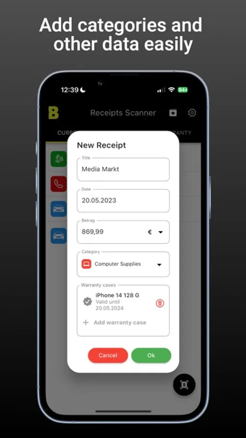Using modern OCR technology, Receipts Scanner tries to recognize the date and the name of the merchant. If a receipt has already been categorized once, the category is automatically assigned when scanning another receipt from the same merchant. All receipts or data are stored only in the app locally on the cell phone. No copies or backups of the data are created outside the app.