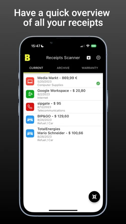 Especially tax advisors and people in administrative fields of activity use Receipts Scanner as a valuable tool for their clients and employees. The app excels especially in practical use. The intuitive operation helps every app user to manage their receipts clearly and send them in a targeted manner.