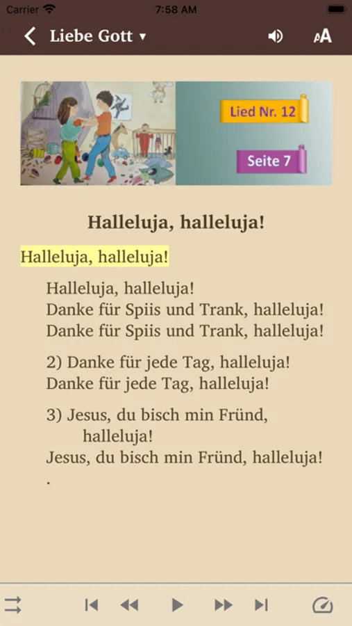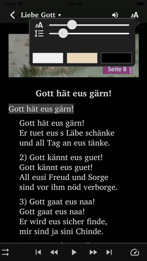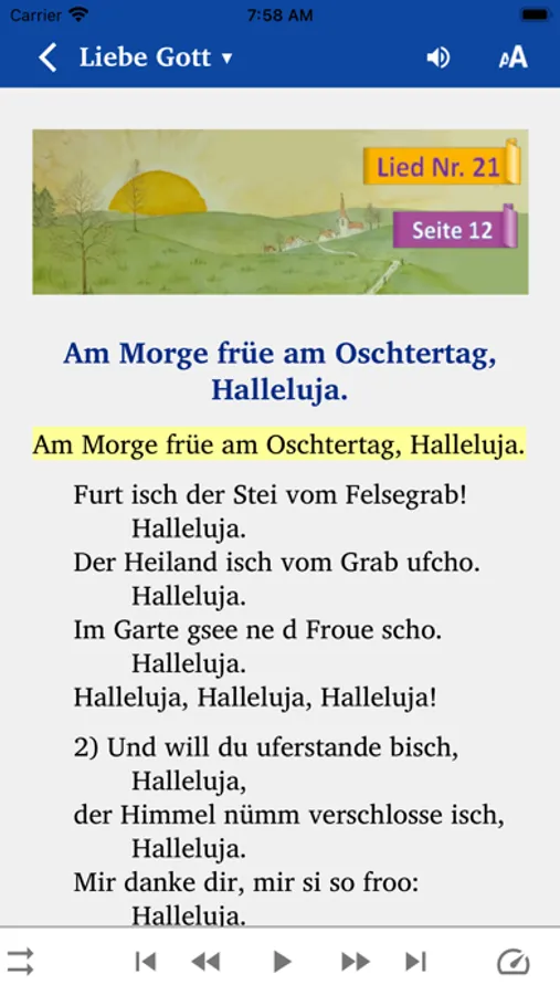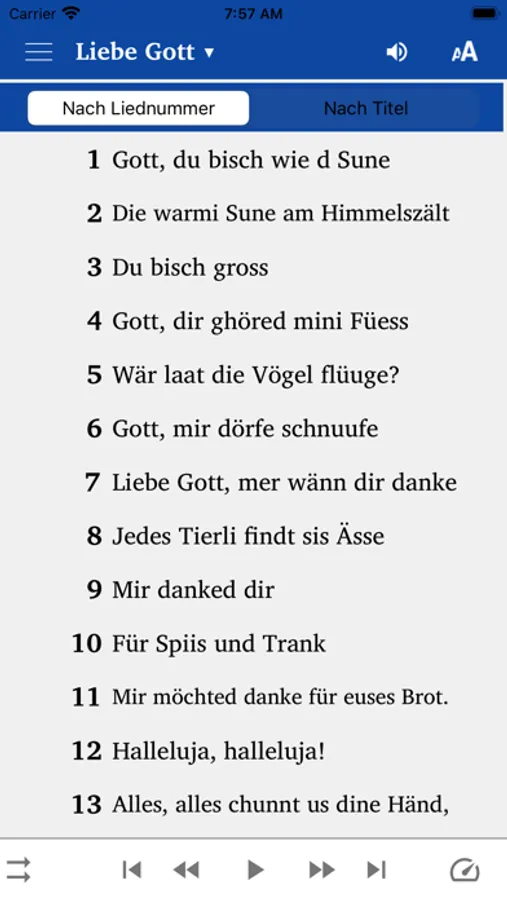 Diese App enthält 56 Kinderlieder in schweizerdeutsch. Audiodateien für jedes Lied sind in die App selbst integriert. Wenn Sie ein Lied öffnen, können Sie auf den Lautsprecher oben rechts auf Ihrem Bildschirm und unten auf die Schaltfläche „Abspielen“ tippen. Der jeweilig gesungene Satz wird gelb hervorgehoben.