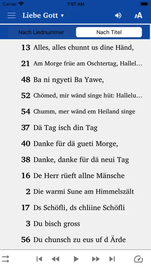 Die App verfügt über zwei Inhaltsverzeichnisse: eines ist nach Lied Nummern geordnet und das andere Inhaltsverzeichnis ist nach Titel, also alphabetisch, geordnet. Sie können ganz einfach zwischen den beiden Inhaltsverzeichnissen oben auf Ihrem Bildschirm wechseln.