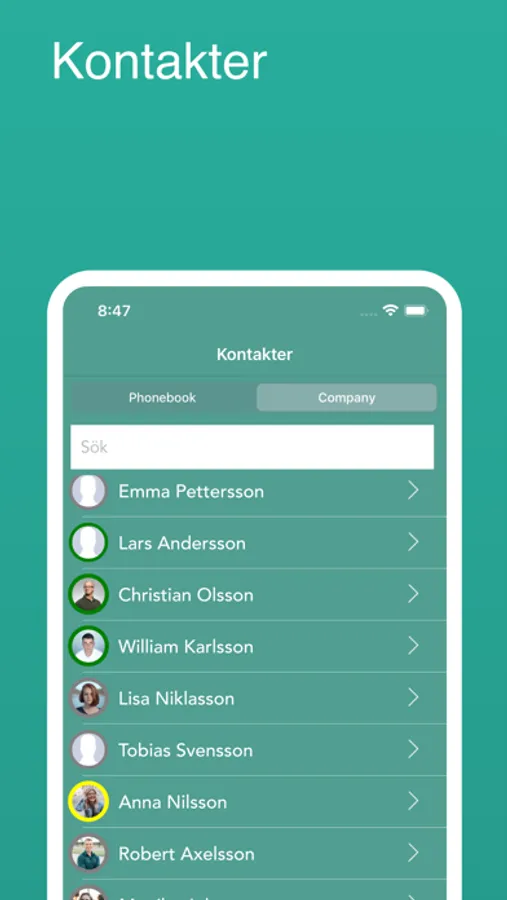 C1-appen förser dig med en levande telefonbok, där du direkt kan se om dina kollegor är upptagna, hänvisade eller tillgängliga. Du kan även ringa externa kontakter direkt från till exempel Outlook, som synkroniseras automatiskt med appen.