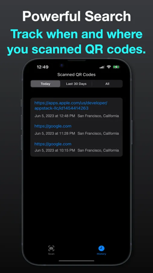 Track QR Codes with Location Data: Unique to QR Scanner, our app stores the location data of each scanned or created QR code. It's perfect for remembering where you found a helpful QR code or tracking where your codes are being scanned for business and marketing professionals.