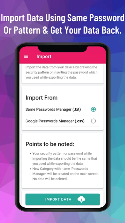Passwords Manager allows users to effortlessly import their passwords from various file formats. Whether it's a Google CSV file, a Passwords Manager (.txt) file, or a Passwords Manager (.csv) file, the application provides the flexibility to import data from other sources.