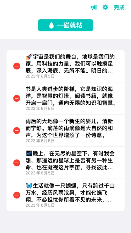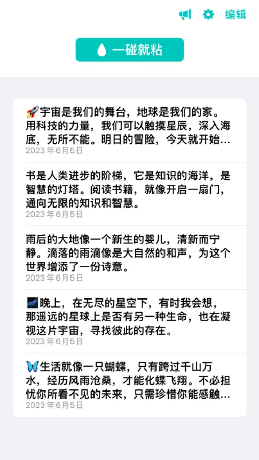 点击设置按钮给它访问剪贴板的权限后,轻触即可将剪贴板中的内容粘贴进橡皮糖,任意点击条目即可将内容放回剪贴板。