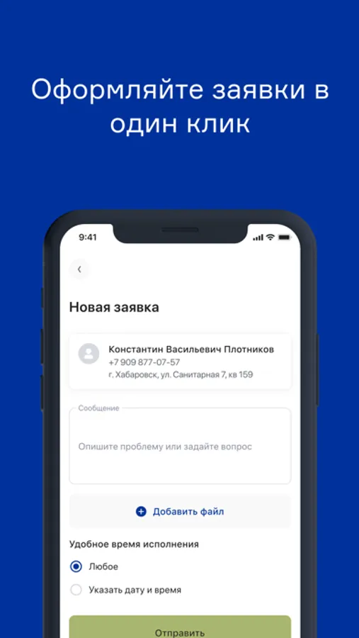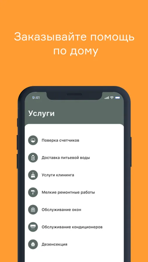 - оформить заявку, узнать время прихода специалиста, общаться с исполнителем в чате, отследить его на карте, оценить качество выполненных работ;