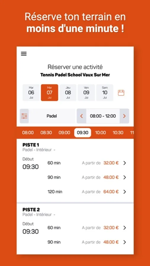 Fini la corvée de réservation ! Avec l'application tu n'as plus qu'à accéder aux créneaux disponibles et à en choisir un. Le club recevra alors automatiquement ta réservation.