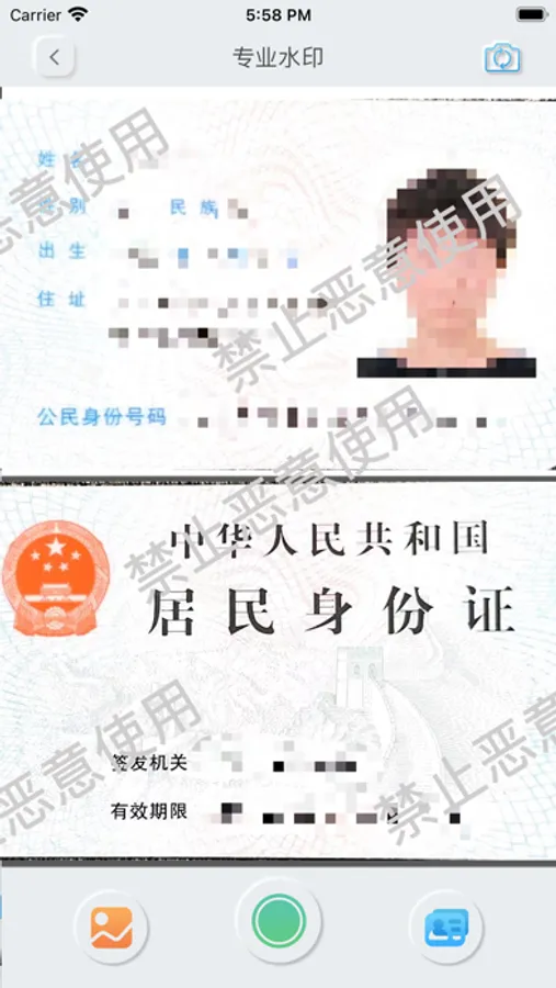 【证件防盗处理】支持相机同时拍两张照片、身份证正反面自动拼合成一张图片,通过水印方式限制证件用途,能够有效防止他人盗用。可用于身份证、驾照、营业执照、护照、毕业证、房产证等各类重要证件添加水印。可自定义水印字体内容、文字内容的大小、排列角度方向、字体内容的颜色,并且可以手指拖动、放大、缩小、旋转等操作。有了防盗水印处理再也不用担心证件被盗用的风险。