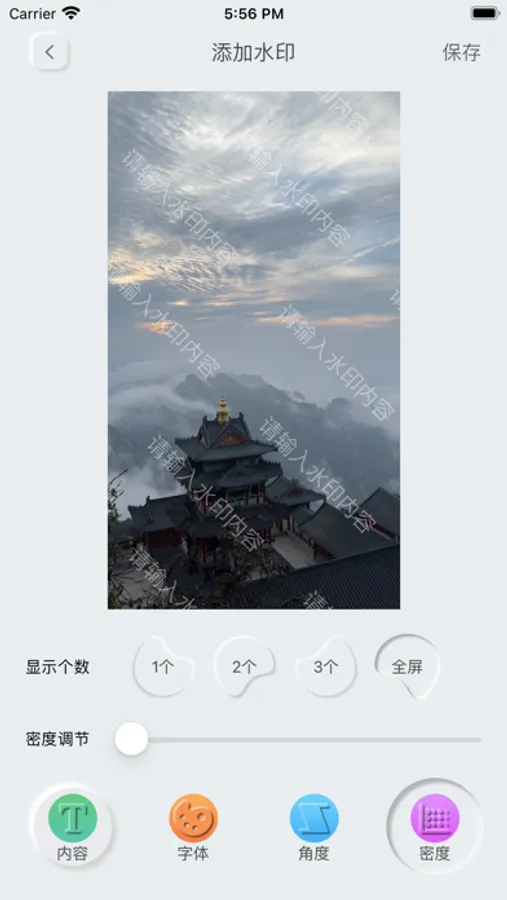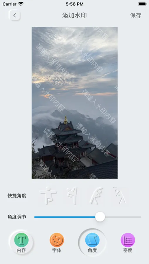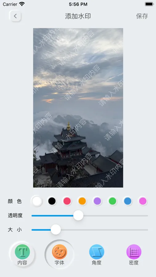 【水印添加】专业图片水印添加功能,包括对字体大小调整,透明度调整,角度调节以及水印丰富度密度的调整,随意自定义水印。