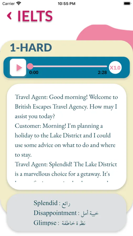Comprehensive Listening Material: Improve your listening skills with access to an extensive collection of TOEFL and IELTS lectures and conversations. This includes a script to follow along and adjust the speed to your comfort.