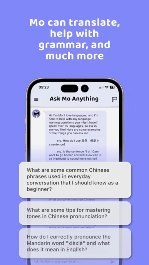 Learn a new language with MoBuddy, the chatGPT-powered language tutor! Mo can practice fully spoken conversations with you, quiz you, and answer any questions you have like a native speaker. Unlike a human language teacher, Mo is fluent in 75 languages, available to help 24/7, and much more affordable.