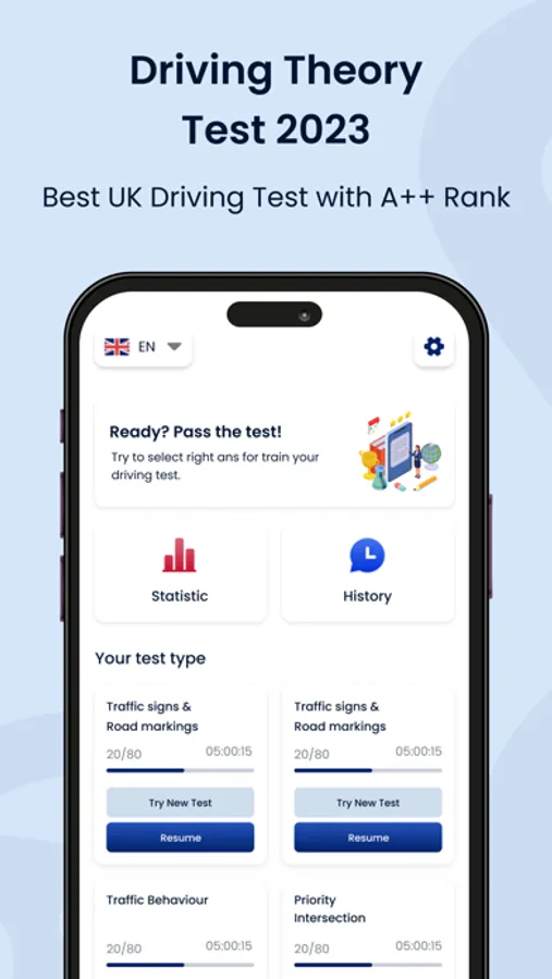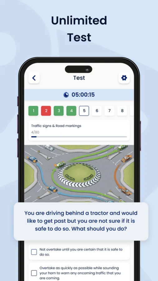 2. Test Mode: Put your knowledge to the test with our simulated driving theory tests. Each test consists of 50 randomly selected questions, providing an exam-like experience and helping you become familiar with the format.