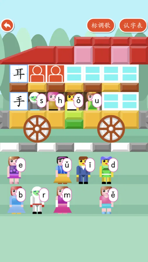 Gameplay: refer to the Chinese characters on the window, read them in pinyin, and drag the passengers representing the pinyin letters to the correct seats.