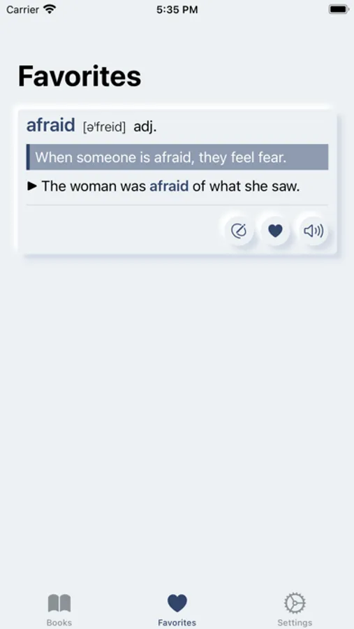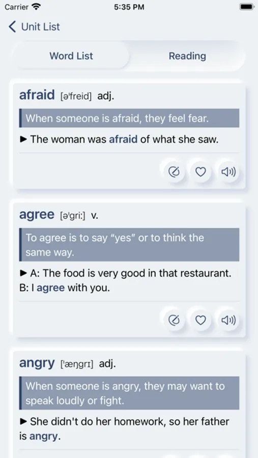 Detailed definitions, example sentences, and audio pronunciation for each word.