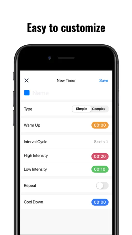 - Customizable sets, high/low-intensity interval and rest for your own need