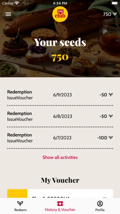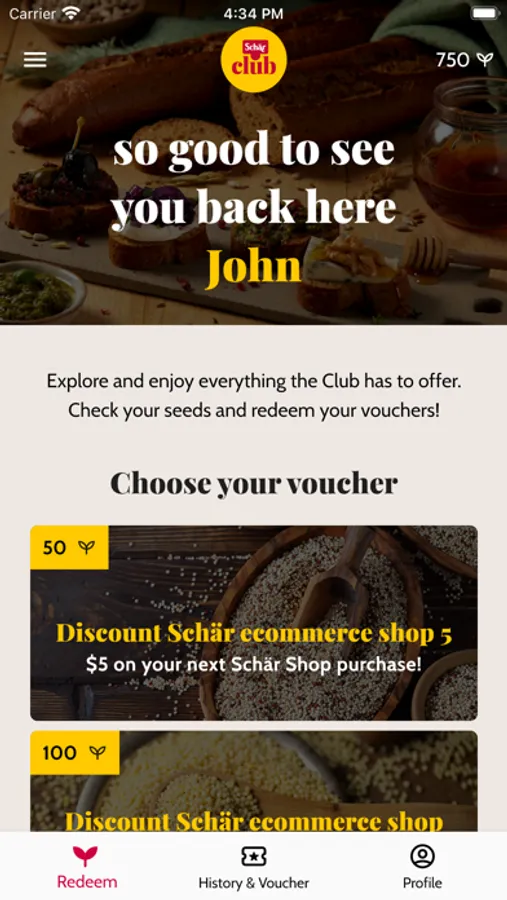 Keep track of your Schär Club seeds, redeem them for vouchers directly in the app and enjoy exclusive benefits.