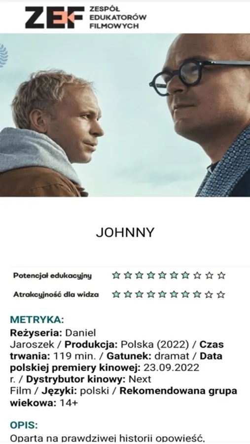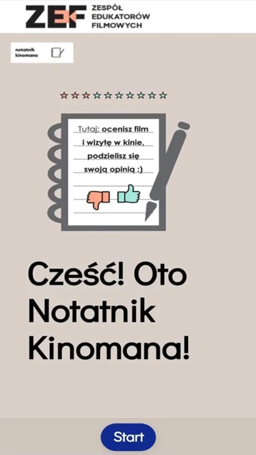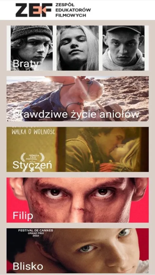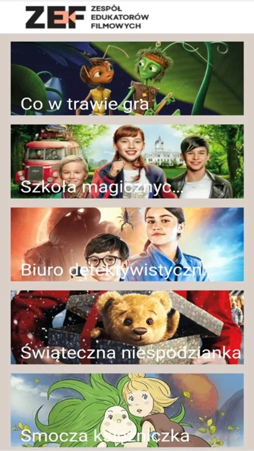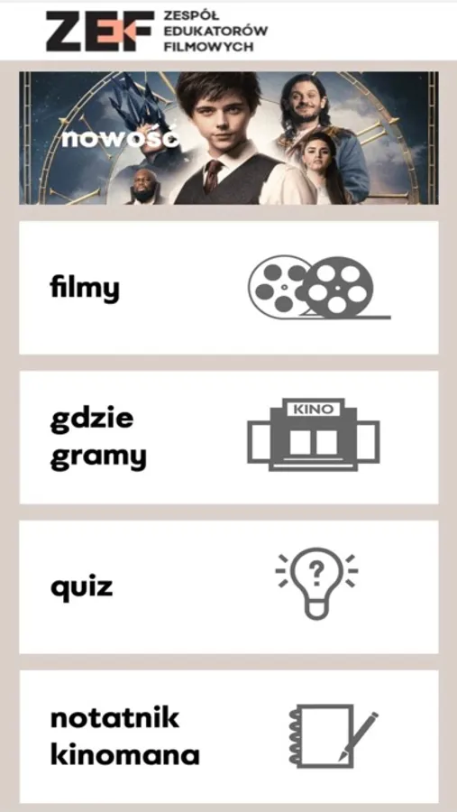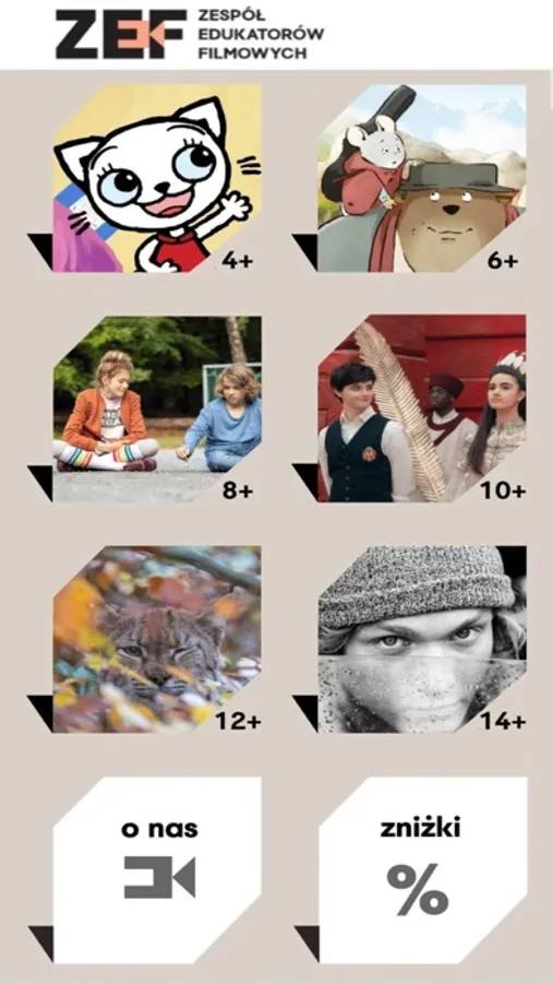 Aplikacja mobilna ZEF zaprojektowana została z myślą o szerokiej grupie miłośników kina: kierujemy ją do dzieci i młodzieży z różnych grup wiekowych, rodziców oraz nauczycieli. Pozwala zanurzyć się w świat filmu w każdym miejscu i o każdym czasie. Dzięki aplikacji użytkownik otrzyma informacje o filmowych nowościach dla każdej grupy wiekowej (zakładka: Nowość), będzie miał dostęp do rekomendacji ekspertów i szczegółowego opisu filmów ze Znakiem Jakości ZEF (zakładka: Filmy), a także może śledzić repertuary różnych kin i terminy wyświetlania seansów (zakładka: Gdzie gramy). Ponadto, przygotowaliśmy dla Was pakiet interaktywnych materiałów edukacyjnych: Notatnik kinomana to przestrzeń, w której użytkownicy mogą wyrazić swoje zdanie na temat seansu, wizyty w kinie oraz pozostawić przemyślenia, natomiast w zakładce Quiz odnajdziecie stworzone przez edukatorów filmowych quizy dotyczące obejrzanych filmów. A to nie wszystko! Zachęcamy do śledzenia zakładki Zniżki, gdzie publikowane są informacje na temat zniżek na seanse kinowe oraz Aktualności, gdzie znajdują się najważniejsze i najciekawsze informacje na temat inicjatyw ZEF.