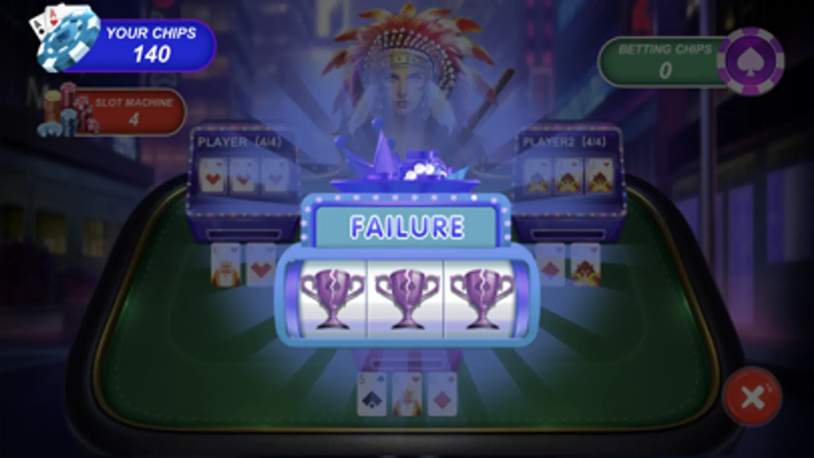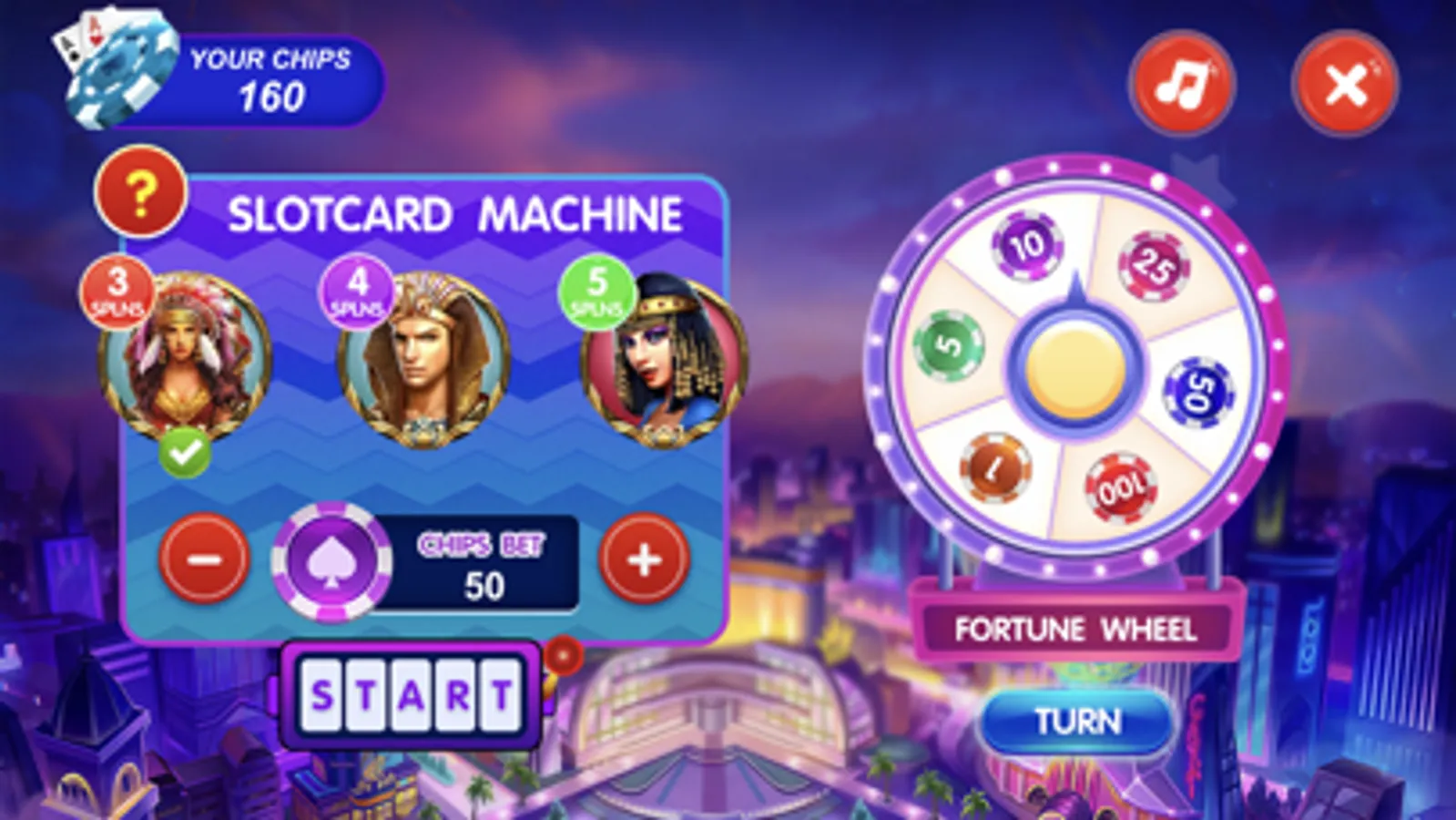 This is a card blackjack game, where chips can be obtained for free through a turntable. Players must develop a good strategy to sustain victory.The match will have 3 players and take turns to spin the slot machine. Each player can choose to “SPIN” to withdraw card or “SKIP” to discard the spin. (You can only draw cards when at least 2 of the 3 symbols of the slot machine are the same). If the player has the highest total of buttons the player wins. (If 21 buttons are exceeded, the button will be counted again from 1)