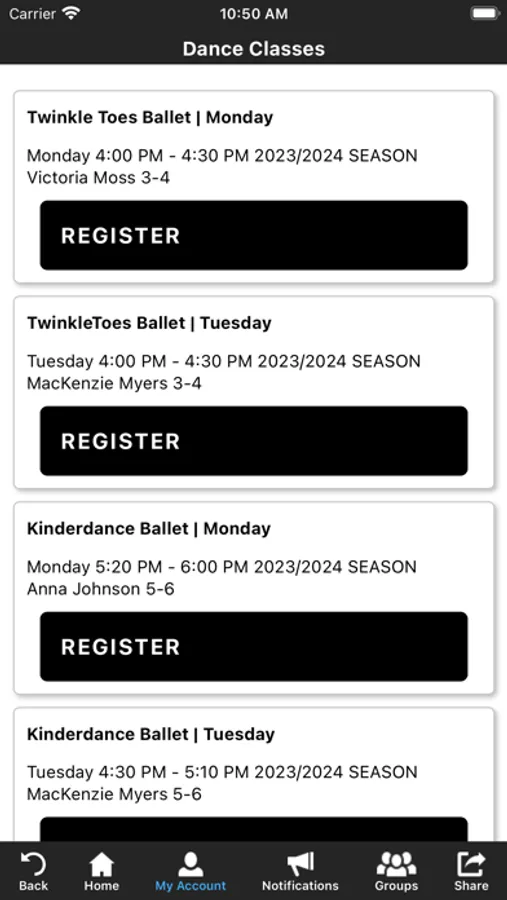 You'll also receive important notifications about class changes, closings, registration openings, special announcements, and upcoming events via the app.