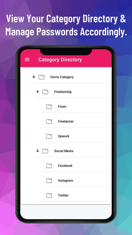 The application offers a hierarchical organization system, allowing users to categorize their data using multi-level categories. This means that users can create nested categories to structure their information effectively. Within these categories, users can store passwords, notes, and other relevant data.