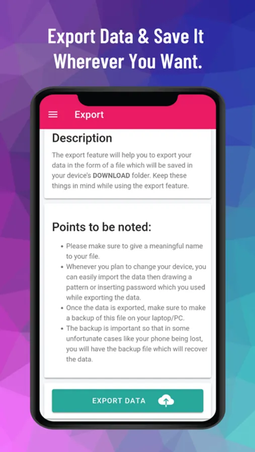 This application is 100% offline without even having the internet connection in this application. It stores data only on the user's device and encrypts it using AES-256 bit encryption, ensuring high security and privacy.