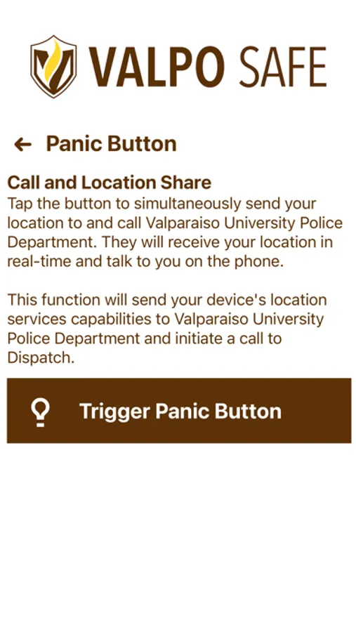 - Panic Button / Mobile Bluelight: Send your location to Valparaiso University security in real-time in case of a crisis