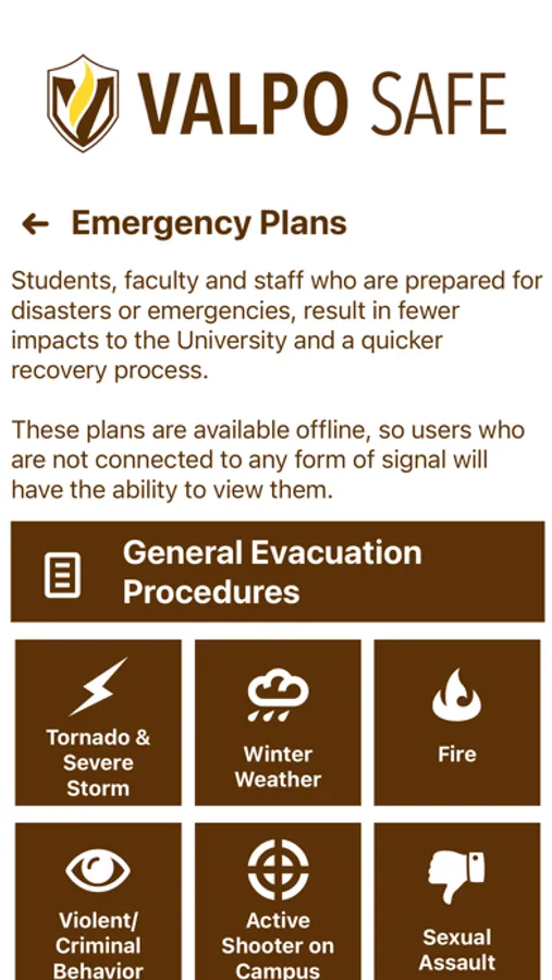 - Emergency Plans: Campus emergency documentation that can prepare you for disasters or emergencies. This can be accessed even when users aren’t connected to Wi-Fi or cellular data.